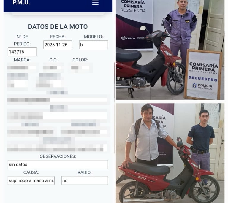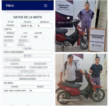 Tras verificar los datos en el Padrón Unificado de Motocicletas, se confirmó que el vehículo tenía pedido de secuestro vigente desde el 26 de noviembre de 2025, solicitado por la misma dependencia en el marco de una investigación por robo con armas.