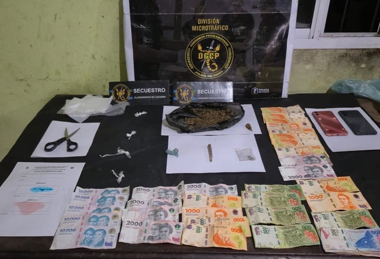 Durante el registro del inmueble, los efectivos secuestraron cuatro envoltorios tipo “bochita” que contenían un total de 2,2 gramos de cocaína. Además, incautaron un envoltorio tipo “bochón” que contenía un cigarrillo armado y otros dos envoltorios, con un total de 18,8 gramos de marihuana. También fueron secuestrados una tijera, un teléfono celular y la suma de 81.500 pesos en efectivo.