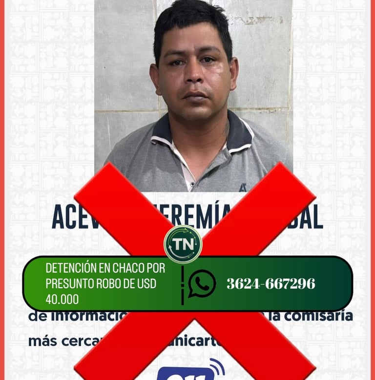 Según fuentes oficiales, Acevedo está sindicado como presunto autor de un robo que habría involucrado la suma de 40.000 dólares estadounidenses. Tras su aprehensión, quedó a disposición de las autoridades judiciales competentes para continuar con las actuaciones correspondientes.