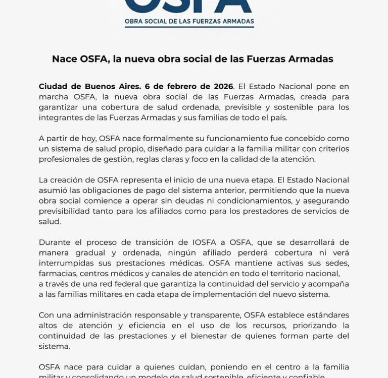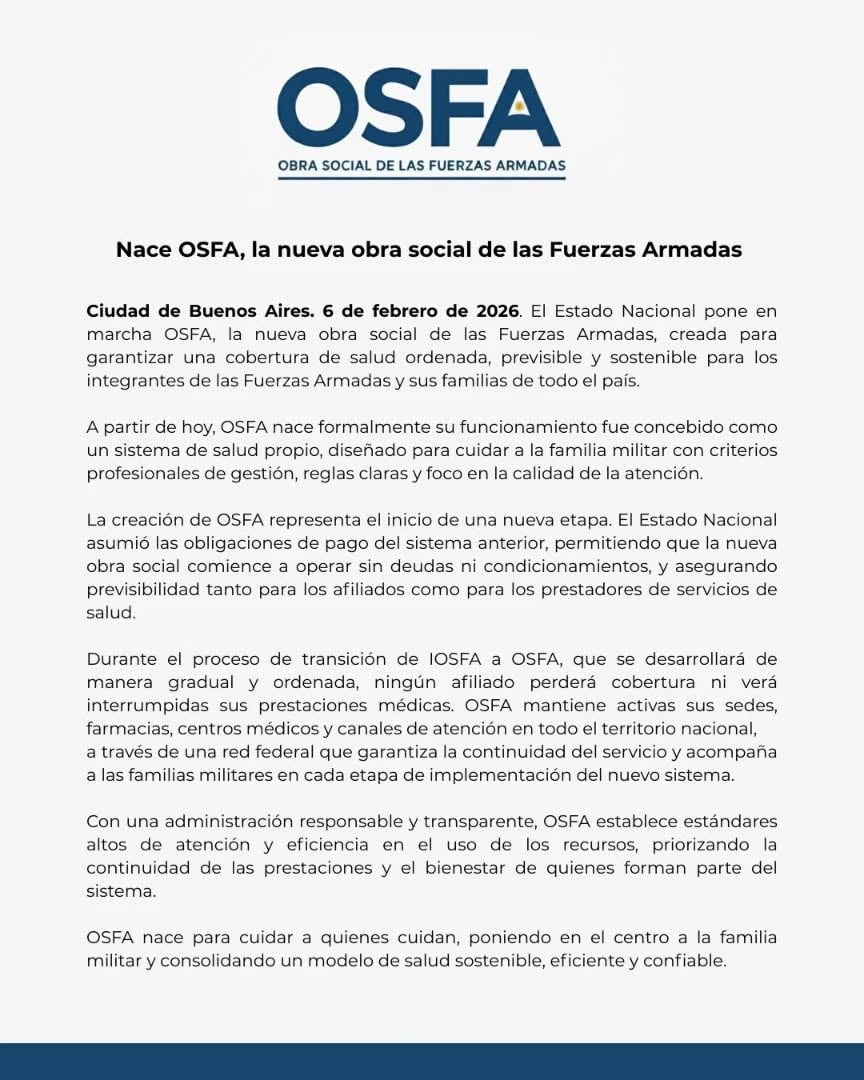Mediante el DNU 88/2026, publicado hoy en el Boletín Oficial, el Gobierno nacional dispuso la disolución del Instituto de Obra Social de las Fuerzas Armadas (IOSFA). En su reemplazo se crean la Obra Social de las Fuerzas Armadas (OSFA), que funcionará bajo la órbita del Ministerio de Defensa, y la Obra Social de las Fuerzas Federales de Seguridad (OSFFESEG), dependiente del Ministerio de Seguridad Nacional.