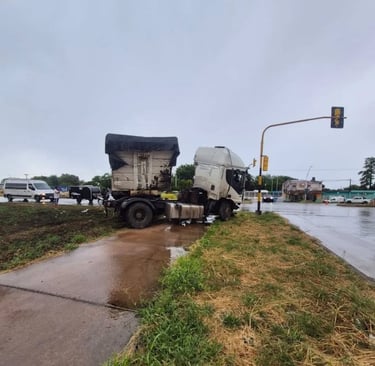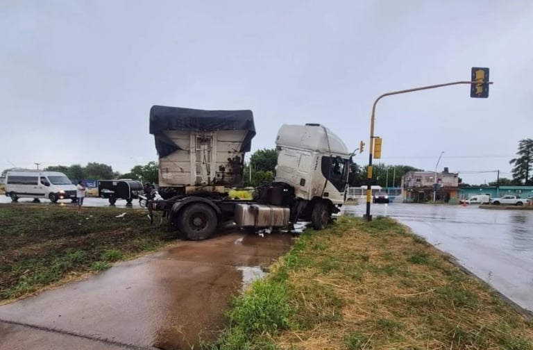 Un camión Iveco perdió el control este lunes por la tarde bajo la lluvia en la Ruta Nacional 11 (km 1002) e impactó contra un semáforo y luminarias del cantero central.