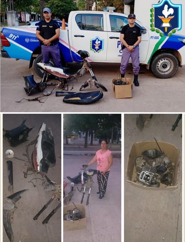 Tras tareas investigativas, los agentes obtuvieron información sobre un vehículo de similares características en un domicilio del barrio Colón. Con autorización de una joven de 23 años, ingresaron a un sector lindante a la vivienda y hallaron una Zanella ZB 110cc blanca y negra, totalmente desmantelada, junto a varias motopartes guardadas en una caja.